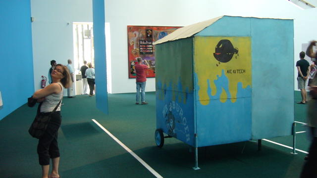After this it was down to the Aue Pavilion, a specially constructed gallery showing the main body of the exhibition. At this point I may be sounding like a stuck record but variable work and odd display. There was a significant amount of painting in the pavilion and the consensus was that it was not of a particularly high standard. The one standout work was ‘Would you like to participate in an artistic experience’ by Ricardo Basbaum in this ongoing work the artist gives locals an art object and a set of instructions to take the object into there lives and document there actions. These pieces of documentation are then presented in the gallery within a sculptural environment featuring the ubiquitous cushions and mattresses of the relational artwork.