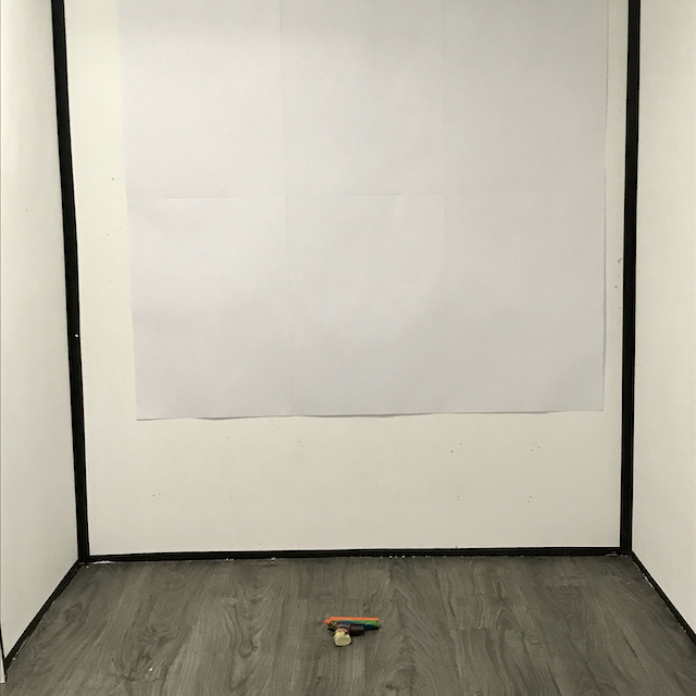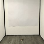 Apprehensively, I enter through an ominous metal security door (from New York), scrawled with graffiti tags, which creaks and then slams behind me. Instantly, I leave the gallery, and I am consumed by contrary feelings of both home and anxiety. The bones of the place creak as I explore the crumbling façade and damp innards of this building steeped in an melancholic fragility- it feels as if it could disintegrate at any moment. An unfettered harsh light from a bare-bulb and the flicker of a strip light highlight the Matrix-type glitch of this construction, of a construction, within a construction and expose a bookshelf cleared of life but layered in grime.