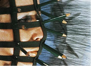 Horn utilises an extensive range of media including, feathers, masks, strapping and restraints, musical instruments and coloured pencils, She literally draws with her head!